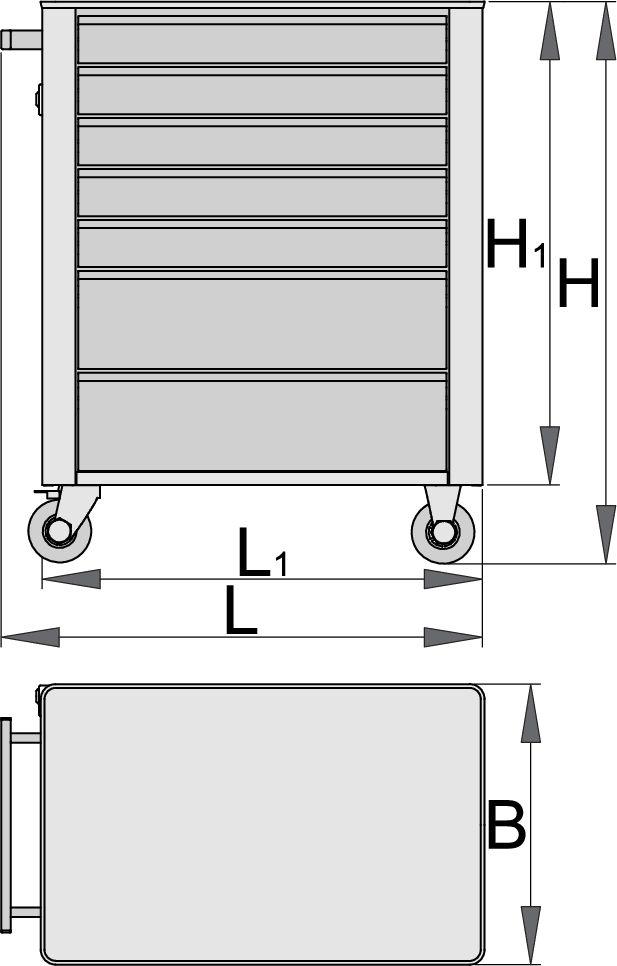 7 fiókkal (5x H 560 × Sz 365 × M 70 mm, 2x H 560 × Sz 400 × M 150 mm)