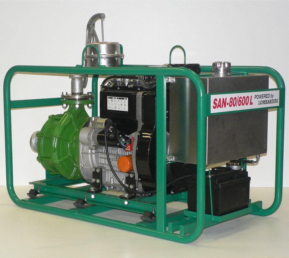 A SAN-80/600 L dízelmotoros öntözõszivattyú mezõgazdasági öntözési célokra alkalmas. A meghajtómotor Lombardini 9LD625-2 típusú kéthengeres léghûtéses dízelmotor, mely hosszú élettartamot, és megbízható, gazdaságos üzemelést biztosít. A szivattyúegység kiváló minõségû Rovatti gyártmányú (olasz) szivattyúegység.